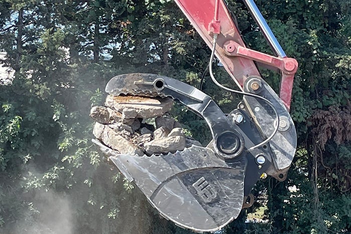 (Findlay, OH) Werk-Brau introduces the Hydra-clamp® bucket with a built-in rotary actuated thumb which maintains consistent clamping force on the load through the entire rotation, for improved flexibility and precision. Constructed of abrasion and wear resistant and high-strength AR400 steel in all critical areas, this versatile attachment is ideal for handling heavy, awkward, or bulky items, moving debris, or sorting scrap, riprap, or other demolition rubble. A helical actuator provides up to 54,000 ft. lbs of torque at 3000 psi, considerably more clamping force than a traditional bucket and thumb set-up, with no exposed cylinders to become damaged. Consistent clamping force throughout the thumbs 120-degree range of motion allows operators to maintain control of materials regardless of positioning. Werk-Brau Hydra-clamp® Buckets include serrated side plates which help secure debris while moving and are available in various sizes to match machines capacities.