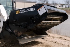 The Werk-Brau Rockhound landscape rake removes rocks from 3/4" to 8" along with other debris, leaving a level seedbed ready for sodding or seeding. With a 72" working width, the Rockhound levels a wide swath, but requires just 13-21 GPM of hydraulic flow. The attachment features rugged steel construction, weighs 1500 lbs., and ensures years of trouble-free service. Skid shoes allow operators to adjust the depth while limiting wear. Constructed of T-1 steel, the teeth are mounted to a double channel replaceable/reversible bolt on tooth bar. The rake bars and cutting edge are designed to provide better leveling for longer ground contact. A hydraulically operated bucket opens from the top for easy dumping and grading. The Werk-Brau Rockhound attaches easily to any skid steer or mini loader, making it ideal for a wide range of landscape contracting projects.